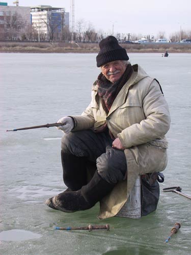 Kazakh ice fisherman on the frozen Ural River in Atyrau.